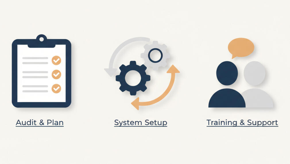 Whether you're starting from scratch or already using tools like ServiceM8, we help you build a simple, reliable workflow that your team follows every day. The goal is less admin, clearer jobs, and faster invoicing.